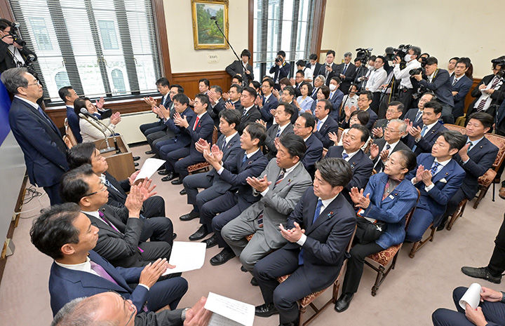 政治改革と物価高対策を推し進め、国民の期待に応えていくことを誓い合った党両院議員総会=21日 国会内
