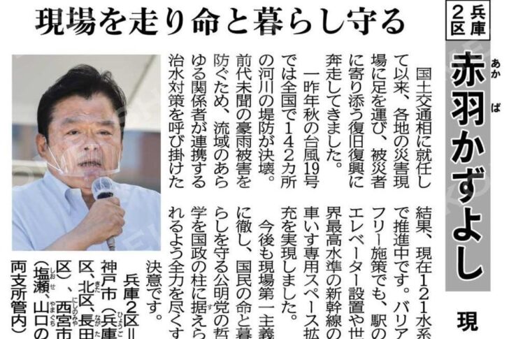 神戸市北区の街頭で力説赤羽氏 公明党の赤羽一嘉幹事長代行は8日、神戸市北区で街頭演説を行い、物価高など「国が直面する危機から国民の命と暮らしを守る」と訴えた。 赤羽氏は、9月末が期限だったガソリンなどの燃油価格と電気・都 … つづきを読む→